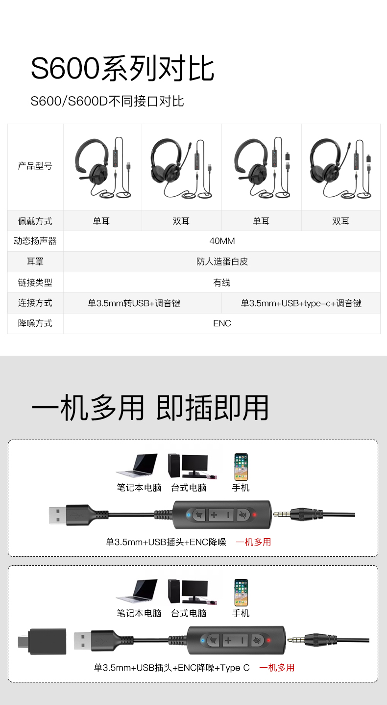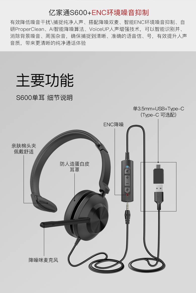 S600 主动降噪ENC 单耳有线耳机